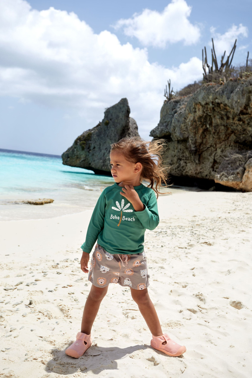 Das grüne, langärmelige Kinder UV Shirt mit UV-Schutz 60 kommt mit einem Palmen Print und extra weichem Stoff. Das atmungsaktive und schnelltrocknende Material sorgt für eine angenehme Passform und Badespaß