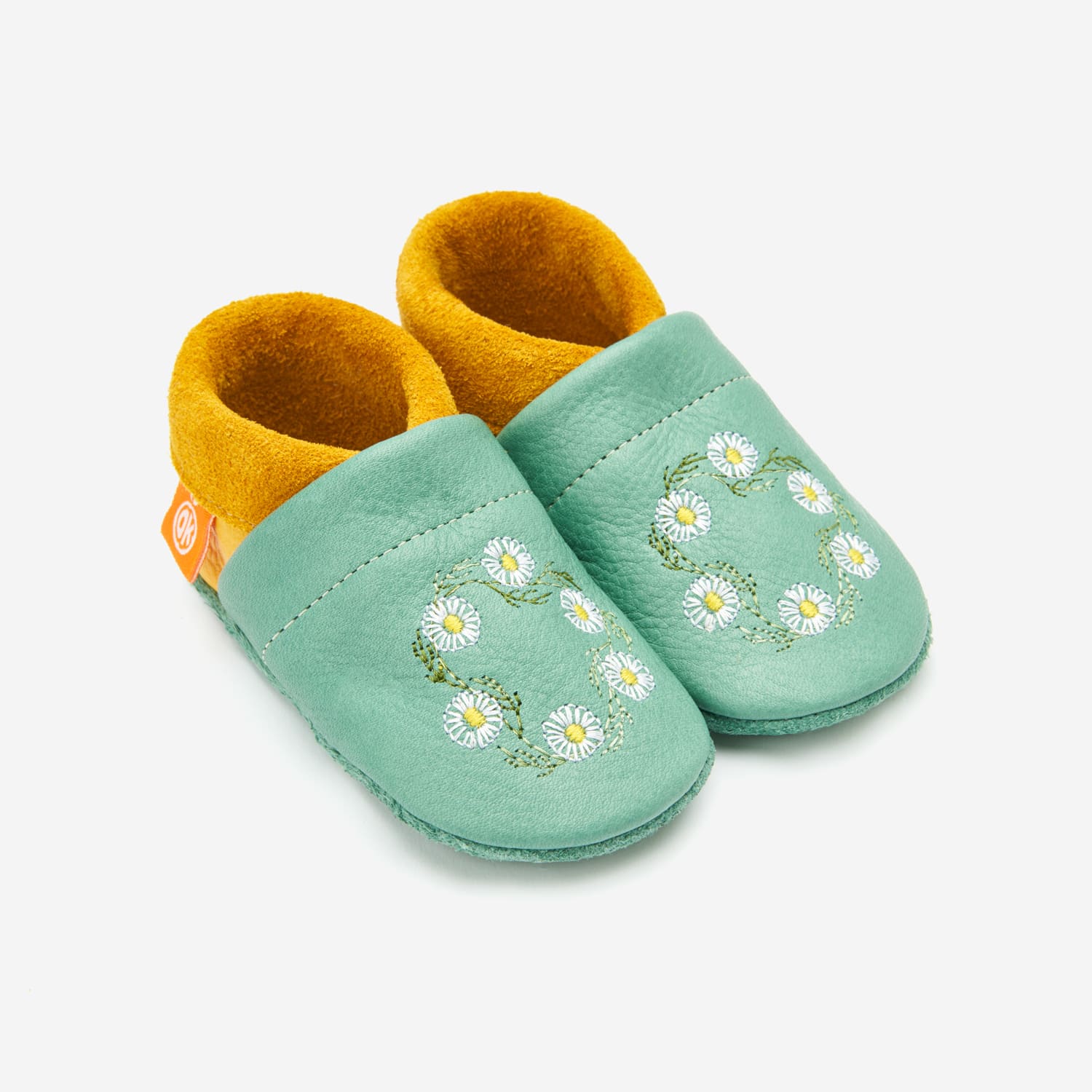 Diese schönen Orangenkinder Leder-Hausschuhe Bella das Gänseblümchen sind vollständig aus atmungsaktivem und pflanzlich gegerbtem Bio-Nappaleder händisch gefertigt.